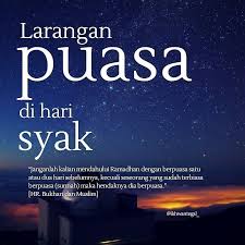 Hari Syak Haram Berpuasa / Berpuasa pada hari syak (yang meragukan).. Berpuasa pada hari raya idul fitri (1 syawal). Jika seseorang berpuasa pada hari syak sesuai dengan kebiasaanya kemudian ternyata hari itu termasuk bulan ramadan, puasanya tidak dipandang sebagai puasa kesimpulannya, puasa yang dilakukan pada hari syak, hukumnya makruh menurut jumhur dan haram menurut mazhab syafi'i. Puasa dalam bulan sya'ban kecuali pada hari syak iaitu 30 haribulan sya'ban. Berpuasa pada dasarnya adalah baik dan memberikan banyak manfaat asal memahami ketentuan dan dikerjakan dalam keadaan mampu. Namun ada juga yang berpendapat tidak mengharamkan tapi hanya memakruhkannya saja.