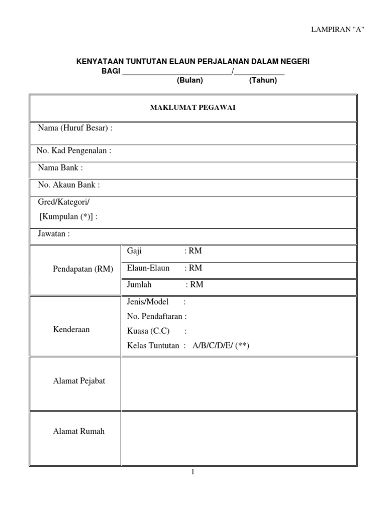 Borang tuntutan perjalanan guru penting untuk guru yang bertugas sebagai pegawas peperiksaan awam. 100%(1)100% found this document useful (1 vote). Kenyataan tuntutan elaun perjalanan dalam negeri. Lampiran a kenyataan tuntutan elaun perjalanan dalam negeri bagi julai (bulan) / 2009 (tahun) maklumat pegawai nama (huruf besar) no. Kenyataan tuntutan elaun perjalanan dalam negeri.